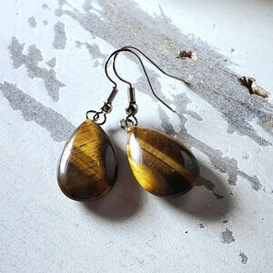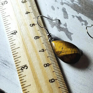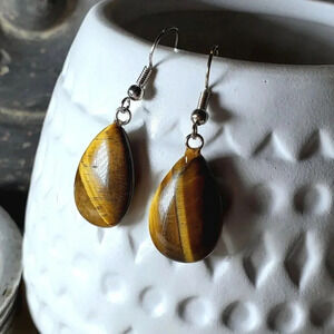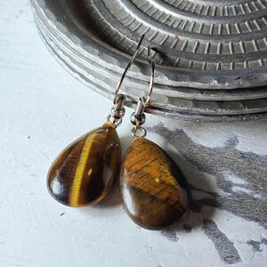 Tigers Eye Puffed Teardrop Handcrafted Brown Silver Gemstone Dangle Earrings