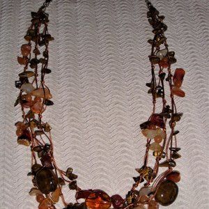 This multi-colored neckless is sizeable. Stone, pebbles, glass and Tiger's eye