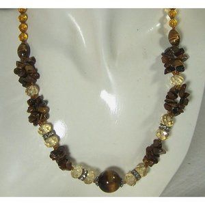 Tiger's Eye Stone Necklace Sphere Focal Two-strand Chips Rhinestone Rondelles