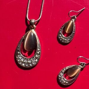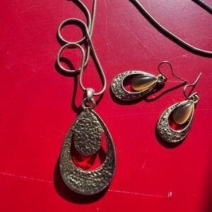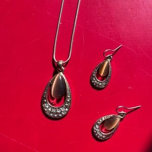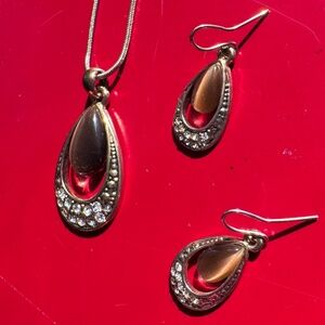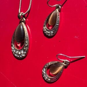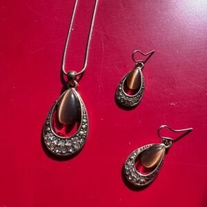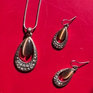 Tigers eye (not sure if it is genuine tiger eye) with rhinestones necklace (pendant & chain) & earrings set.