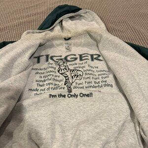 Lined Tigger jacket with a hood from the Disney Store made in the early 2000's. Size L. Lined with cotton so it's a warm jacket. Jacket has a discoloration around the neck and a small blemish on the left pocket, otherwise there are no other issues with the jacket.