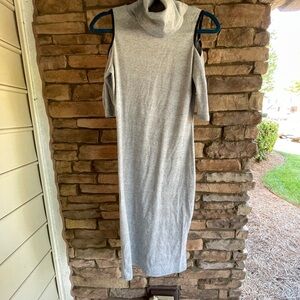 Stylish gray midi dress with cold shoulder design. Perfect for any occasion.