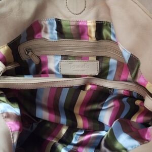 Crafted in buttery soft premium leather. Functionality with elegance. Spacious interior and refined design. Dual shoulder straps. Silver-toned hardware. Magnetic top closure. Signature Tignanello striped satiny lining. Measures approximately 13"x15"x6". From a smoke-free but pet-friendly home. See pics for condition.