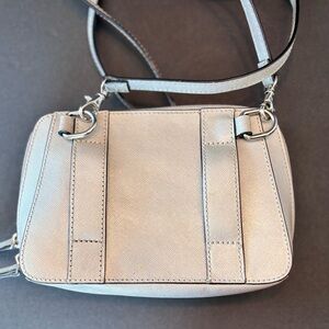Tignanello Est 1988 Silver Bella Belt Bag Crossbody purse. The 23” strap can be unattached and made into a belt bag utilizing the loops on the back of the purse. Lots of pockets and storage inside. Two zippered pockets, one open pocket, and 2 credit card slots that are RFID protected. In very good pre-owned condition (owned by my 87 year old mom) with some minor scuffing on the silver front plaque and a small color flaw in the upper corner. Please view all photos as they are part of the description. Purse measures 8” across, 5.5” tall and about 2” wide.