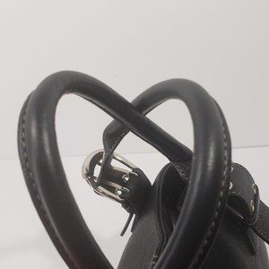 High quality, very nice classic pebbled black leather bag, purse, satchel with silver toned hardware and adjustable buckles by Tignanello. Buckles are engraved with “Tignanello.” Four silver toned feet on bottom. Magnetic closure and inside snap straps. Double handles drop about 6”.