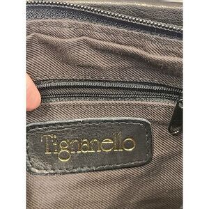 The bag has a soft leather finish, accented with a logo charm and gold hardware. It also has an organizer feature to help keep your belongings in place. The lining is made of black leather and the strap is made of black leather. This Tignanello bag is a great addition to any woman's wardrobe.