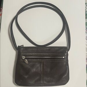 Elegant brown leather bag with embossed logo. Features stylish interior lining.