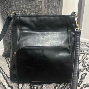 Stylish black leather crossbody bag by Tignanello. Features a front zip pocket and adjustable strap. Perfect for everyday use.