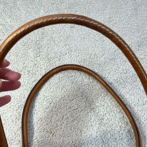 There is a small stain on front as shown in pictures and some wear on the inside leather of the zippered pouch also shown in pictures. The patina of this bag is gorgeous!