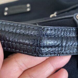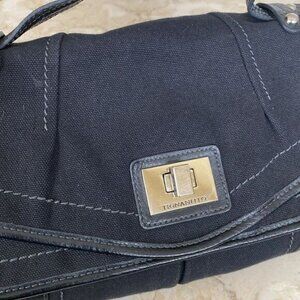 In excellent preowned condition rare vegan bag from Tignanello. This beauty is made of heavy black cotton canvas and vegan leather and features a classy “doctors” satchel design with a fold over flap and turn lock closure.