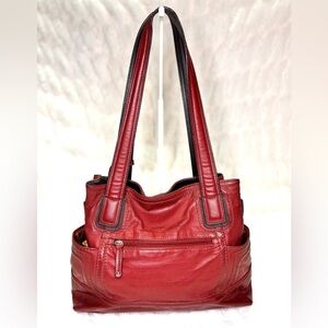 Tignanello Leather Super Stitch Drawstring Shopper Shoulder Bag in Glam Red. Minimal wear on corners on bottom of bag, and one small leather crack as pictured.