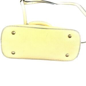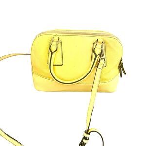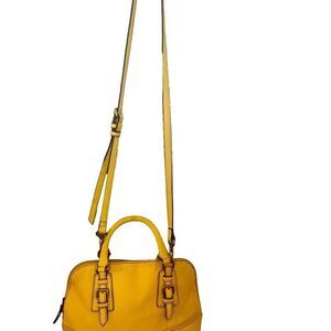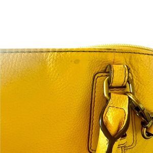 Yellow crossbody with removable strap. Crossbody strap extends to 20”, handle drop 4”. Small spot near top zipper as seen in photos. Inside zip pocket, 2 smaller pockets, soft leather, measures 12” x 7”. Great bag!