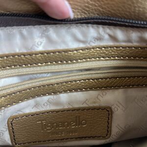 This Tignanello genuine leather crossbody purse is crafted in a stunning soft metallic gold tone with rich brown trim and silver hardware. It features a buttery-soft pebbled leather exterior, Tignanello’s signature logo plate, and a front zip pocket for convenience. The interior is lined with branded fabric and includes organizational pockets—though there are ink stains inside (shown), the bag remains functional and stylish.