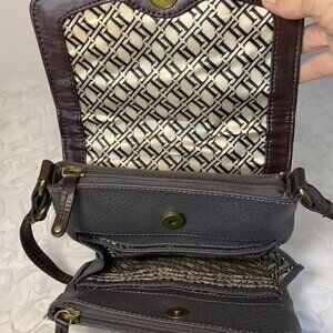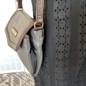 A smart little Tignanello grey leather crossbody bag with contrasting brown trim. Features include: Rear zip & rear slip pockets. Brown leather adjustable crossbody strap with a maximum drop of 23". Metal snap flap closure opens to twin zip compartments attached by a metal snap which itself opens to reveal a hidden wallet style compartment with ID card slot and 2 slip pockets. First zip compartment has 1 zip/1 slip pocket. Fabric lining.
