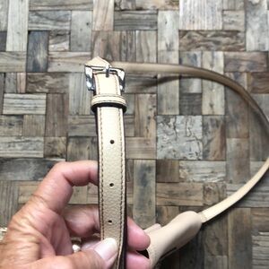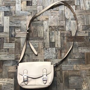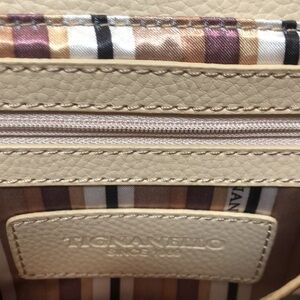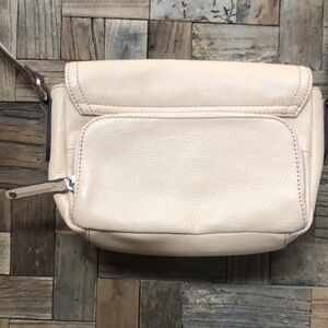 NWOT Tignanello Leather Crossbody Bag. Cream with adjustable shoulder strap. Silver tone hardware. 2 magnetic closures on front(faux buckles). Open pocket and zippered pocket inside. Zippered outside pocket/pouch with ID/card slots and zippered pocket. Great all-season bag!