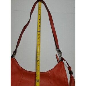 This Tignanello cross body/shoulder bag purse handbag is a stylish accessory for women. With a bag width of 13 inches, bag height of 9.5 inches, and bag depth of 3 inches, it is a medium/large sized bag perfect for any occasion. The exterior is made of high-quality leather and features a dark orange/red color with papaya shade accents.