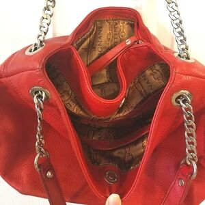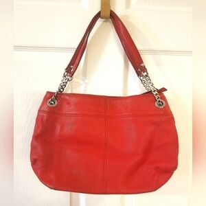 Beautiful bright red Tignanello Purse, genuine leather, in great condition, one small black mark on front as pictured, perfect for holiday outfits, nice medium size, lots of zippered pockets.