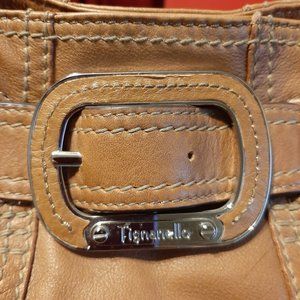 Tignanello real leather mid-sized shoulder bag - Warm Brown with gold accents that really shows off the very fine, soft, pebble-like texture of the leather. There is a large leather and gold buckle in the front, with the Tignanello name on the bottom of the buckle. The bad has two side pockets at the end that are great for cell phones or keys. There is also a leather and silver tag hanging from the handle. The handle is not only edge-trimmed in black, but is stitched four times for strength.