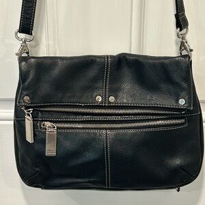 Tignanello Small Black Pebble Leather Crossbody Bag, Pockets, Silver Hardware