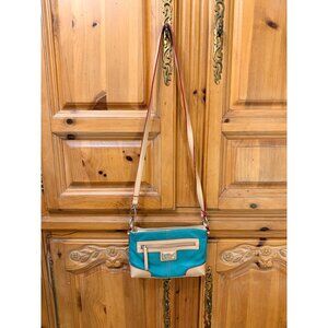 This Tignanello crossbody bag features durable turquoise pebbled leather with beige accents for a stylish design. Includes front zip pocket, adjustable strap, and pristine interior. This can be worn as a shoulder bag or crossbody purse.