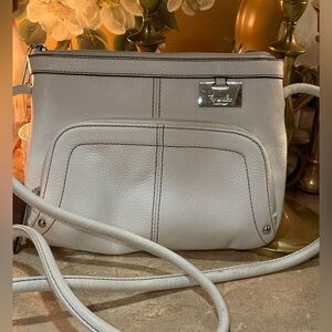 This stylish crossbody bag from Tignanello features a chic white and gold color palette, perfect for adding a touch of elegance to any outfit. Its compact design and adjustable strap make it ideal for everyday use, while the high-quality materials ensure durability and a luxurious feel.