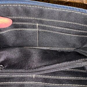 Elegant blue genuine leather with embossed branding. Multiple card slots. Perfect alone or with your favorite bag and for everyday use. Good condition. Thanks for looking!