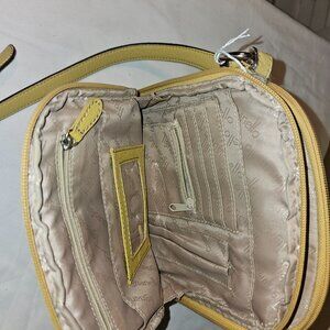 Tignanello Golden yellow leather over the shoulder/crossbody adjustable strap, magnetic close at Tignanello medallion. Interior compartments have 2 zippered pockets, credit card, ID & pen section, additional zippered and slip in compartments. Purse has 1 exterior slip in pocket and is nicely accented with stitching. 9H x 9W