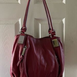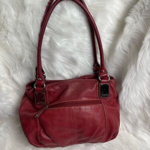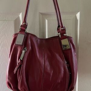 Tignanello leather Red shoulder bag with silver tone hardwares two front zipper pockets back zipper pocket magnetic top closure the satin colorful inside lining has a zipper compartment a side zipper two side pockets pre owned in good used condition small wear spots no tear see all pictures any questions please message
