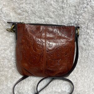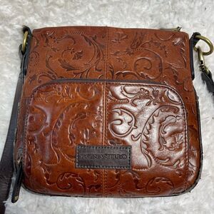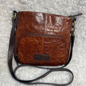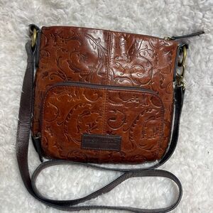 Tignanello leather brown embossed crossbody bag with faux leather trim & strap front zipper pocket a top zipper compartment and a top snap closure compartment the inside lining has a side zipper. Pre owned in good used condition some peelings on the trims and the strap see all pictures any questions please message.