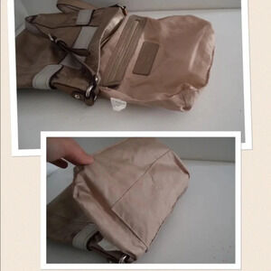 Tignanello cross body bag. All leather with silver toned hardware. Measures 10" x 10" shoulder drop 19. Two front zip pockets and one in the back. Zip closure. Light brown and pewter color. Silver tone hardware.In excellent condition!