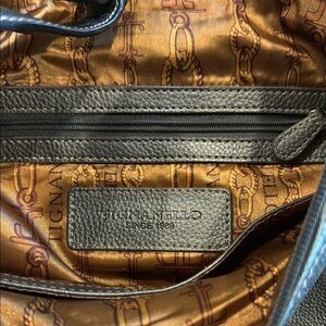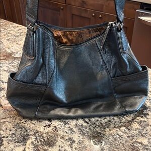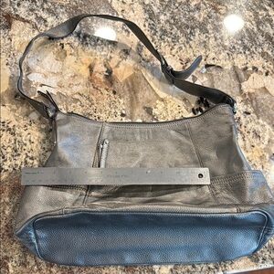 Elegant leather shoulder bag in silver and black. Features a sleek design with a front zipper pocket.