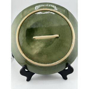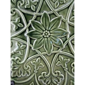 The Tii Collections Moss Green Embossed Ceramic Plate is a vintage-inspired piece with an Art Nouveau style, featuring a round shape and a beautiful green color. Handmade in America with a glossy finish, this decorative plate is perfect for all occasions and adds a touch of elegance to any table setting. The intricate flower pattern and Art Pottery production style make it a unique and charming addition to your home decor, while the 10.5" diameter ensures it is perfect for displaying or serving. It is unmarked. It is in VG vintage condition with no chips. There are some scuffs on the the bottom from normal use. It weighs 2.11 lbs.