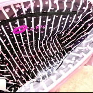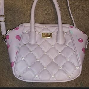 This purse is a light lavender and pink color with cherries on the sides.