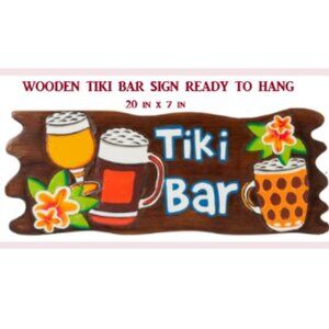 Tiki Bar Brown Wood Sign Treat your guests to a tropical vacation without leaving home! Our 19in Tiki Bar Brown Wood Sign with Carved Tropical Drinks is sure to evoke an island getaway with its tropical tiki style and drinks vibes. Tiki Bar Wood Sign measures 19" x 7.5" in size