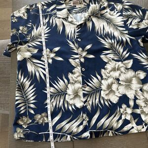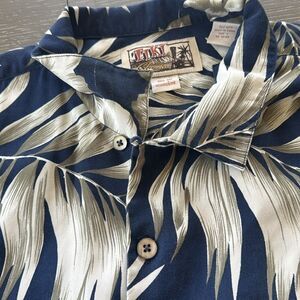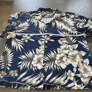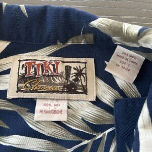 Tiki Classics Men’s Size L 100% Silk Hawaiian Button Up Shirt Navy Floral Casual