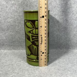 * Classic tiki cup with carved face design and bright green glaze with dark brown highlights
