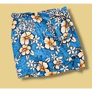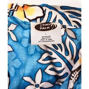 Vibrant Tiki Palm women’s Hawaiian wrap-around cover-up skirt in a bold blue tropical floral print. Features lightweight viscose fabric, adjustable tie closure, and 18” length. Size Large, gently used and perfect for beach or resort wear.