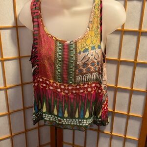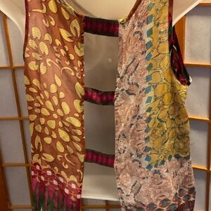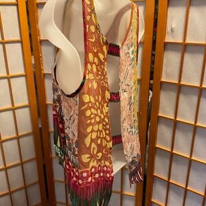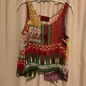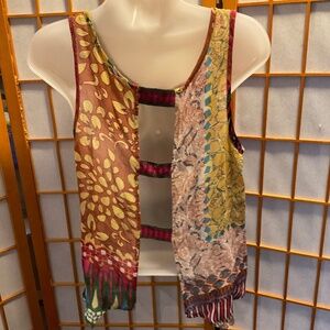Super fun, tiki party, semi transparent patterns in various bold patches. This unique tank top is flat on the front but almost reverse vest style in the back with scalloped, pointed, curtain style back connected with 3 strips of fabric for peekaboo effect. I cut the tags off of this to wear it in New Orleans. I’m pretty sure it’s an XS but it’s meant to be a flowy fit.