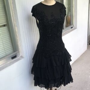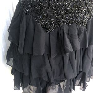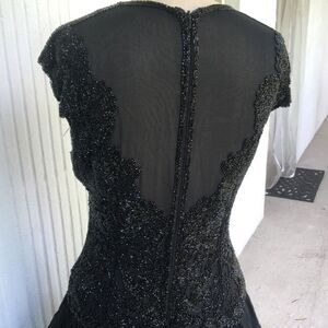 Beautiful, black and beaded dress. Top is sheer bottom ruffles chiffon. Lining all the way to the bottom which could be cut to make the bottom see-through. Bead work is very detailed. Measuring across the shoulders to the edge of what would be the cap sleeve is 18.5 inches. It’s a pit is 17 inches where the ruffles start is 17 inches from the top of the shoulder to the bottom of the dress is 41.5.