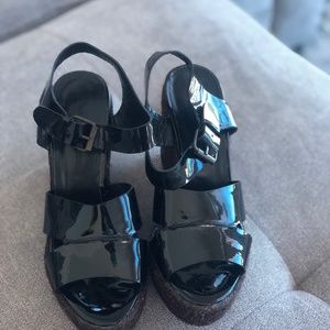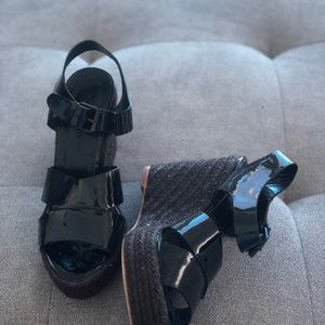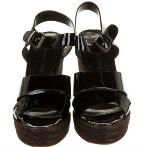 Patent leather Tila March wedge sandals with buckle closures at ankles and jute heels. Includes box.