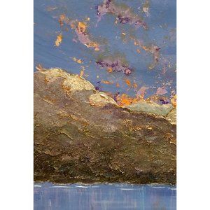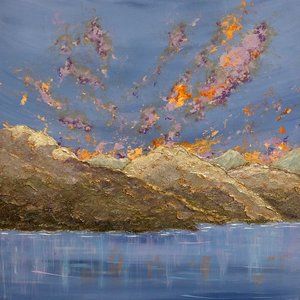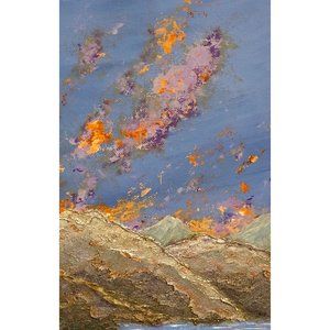Love the outdoors? Landscape scenery? This beautiful painting is 12" x 12" and is titled "Til You Find Your Dream" and was hand painted by local Dayton Ohio artist Deb Bossert. It depicts a gorgeous landscape scene with a colorful cloudy sky and mountains in the background and a shimmering lake in the foreground. There are many colors in the painting - blue, orange, purple, gray, gold, white, black.