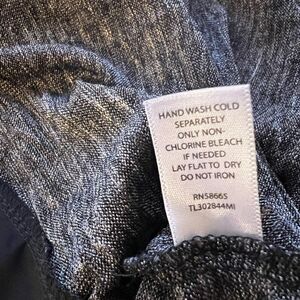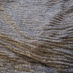 Very cute, and lightweight tank top with rippled texture (see last photo for reference). Very deep V in the back. Gray/silver in color with black trim. Fabric is on the thin side. Not quite sheer, but close.