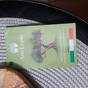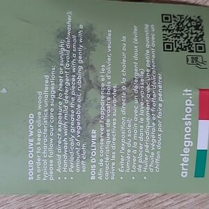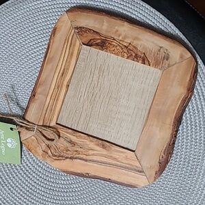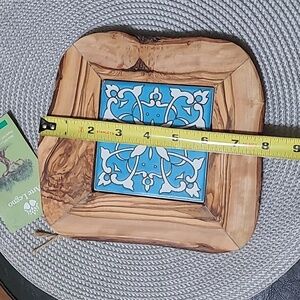 Solid olive wood, decorative ceramic tile, twine hanging option or can be displayed countertop