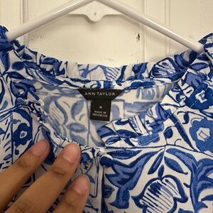 EUC “Tiled Mixed Media Ruffle Button Shell” from Ann Taylor. Size medium regular. Color “Nile Blue.” Materials tag pictured