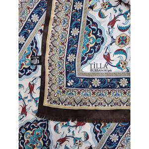 The Tilla 100% Silk Scarf in a lovely turquoise with a rust floral border print is in excellent, clean condition without any flaws. The colors are vibrant and truly beautiful!