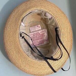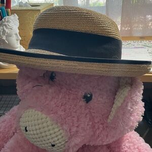 Classic woven raffia sun hat. Wide brim with black band and black edge trim, as well as a strap for security. Adjustable size small. Lightweight and breathable. Stylish and versatile for sunny days. Crushable. Packable. Secret pocket. Water resistant. Removable sweatband. **pig not included, solely for modeling purposes 🤣