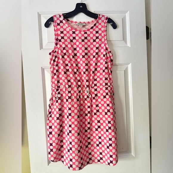 Tilley Tech Slk Tank Dress in Pink Tile. Cute pink and white pattern. Sleeveless and light weight. Has a drawstring waist. Size XS. Excellent condition. #preppy
