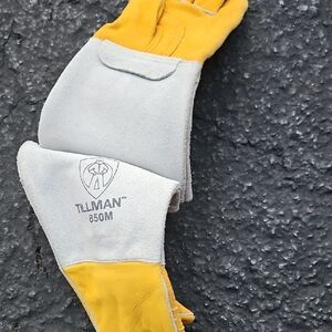 Tillman elkskin welding gloves in yellow and gray. Durable and protective.