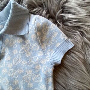 Tilly’s Girls collared Sweater shirt, XS mushroom print-light blue and white, has light wash and wear.