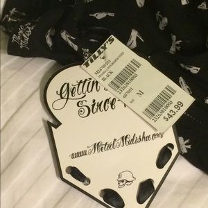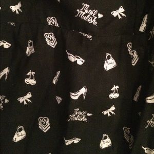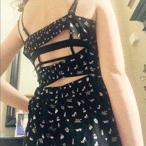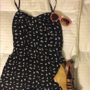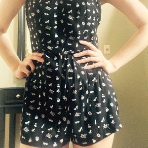 Black v-neck, spaghetti strap romper with girly white pattern (close-up included in pictures). Has an elastic band in the back and a side zipper for easy removal. Made of 100% rayon. Can be dressed up or down. Would look great with wedges or sandals! --Offers or trades welcome :)